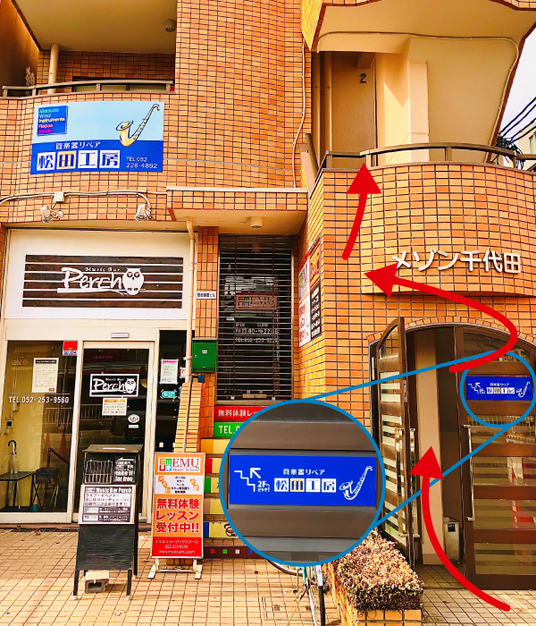 2階ベランダにある店舗看板を目印に建物へお越しください。